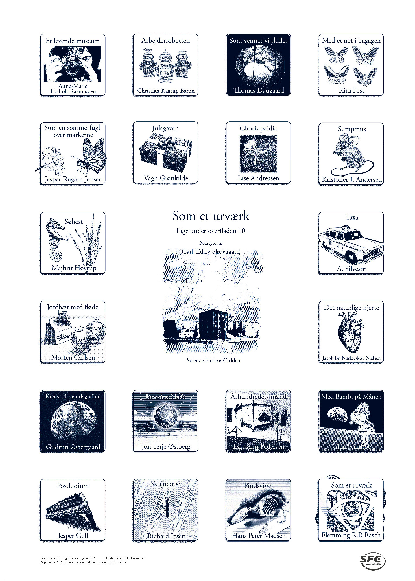 Den tiende Lige Under Overfladen-antologi Som et urværk er nu udkommet. I anledning af jubilæet har Manfred Christiansen tegnet nogle meget fine sort-hvide vignetter til alle novellerne. Det er også Manfred der står for forsiden med den mystiske bygning på Københavns havnefront. Antologien er som altid redigeret af Carl-Eddy Skovgaard.